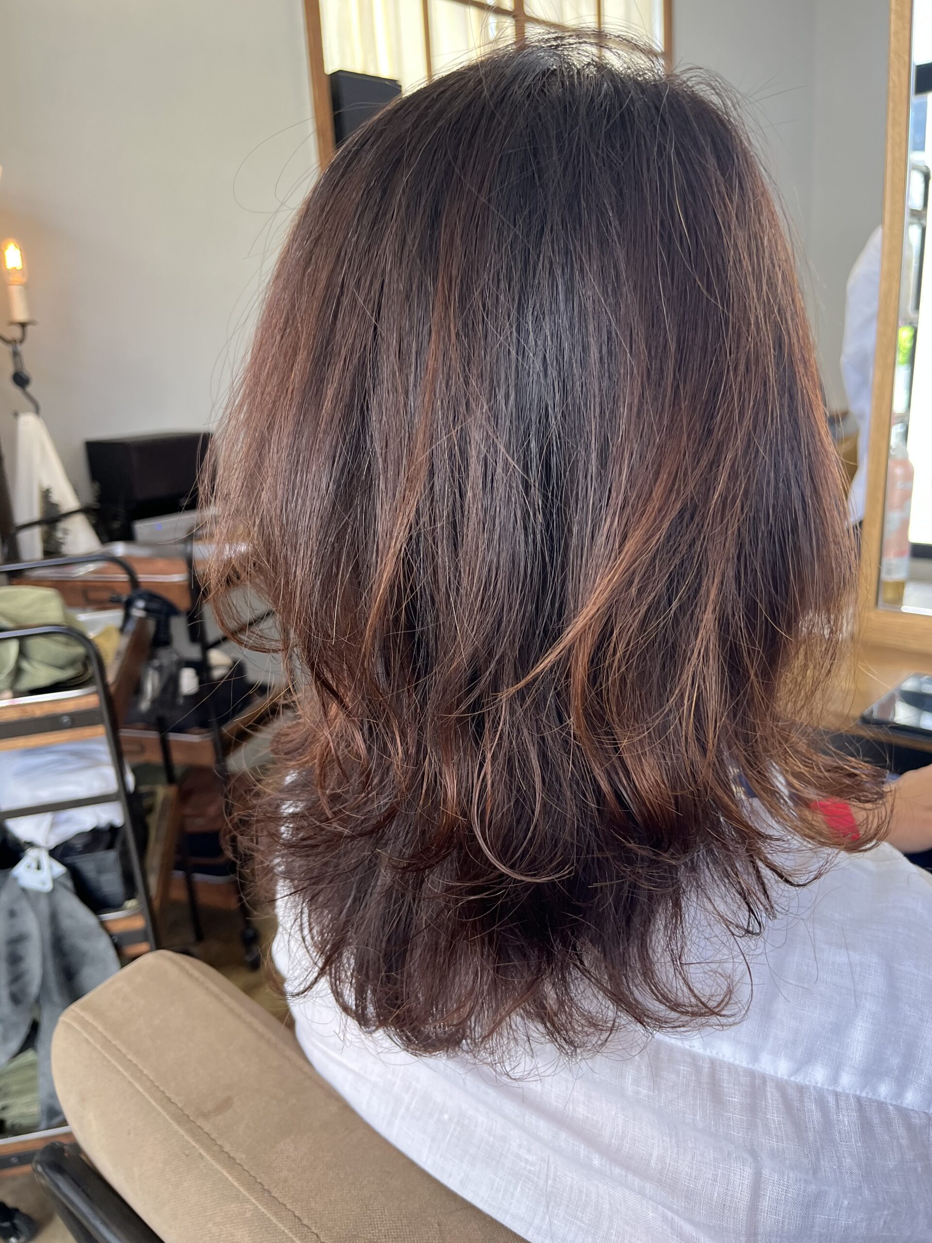その上で、根元は自然に伸ばし、毛先は薬剤を使わずにそのまま活かす設計で施術を進行。ツヤ感と扱いやすさ、そして毛先の柔らかさを両立した、上品なニュアンススタイルに仕上がりました。